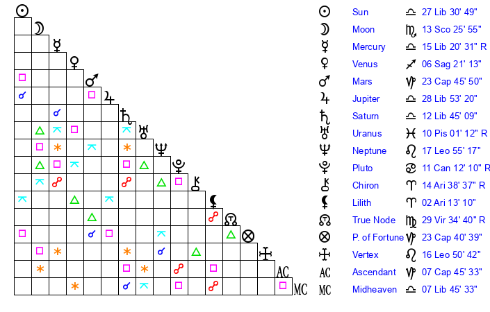 | Sun | 27 Libra 31 | 28 Libra 33 | 11 Aquarius 50 |
