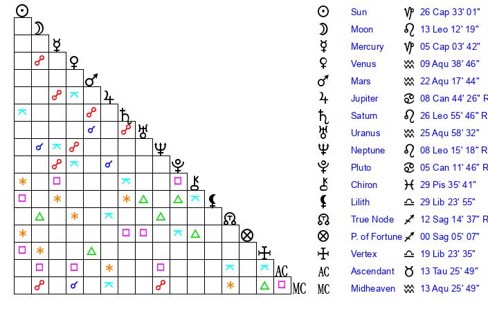 | Sun | 26 Capricorn 33 | 27 Capricorn 50 | 12 Taurus 12 |