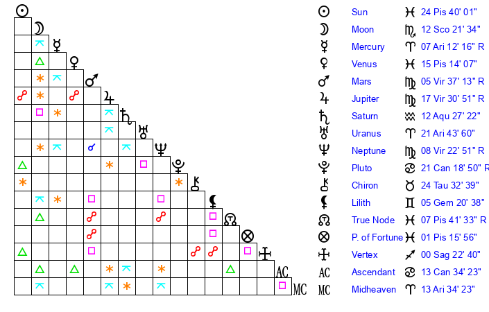 | Pluto | 21 Cancer 18 | 3 Aquarius 14 | 22 Cancer 12 |