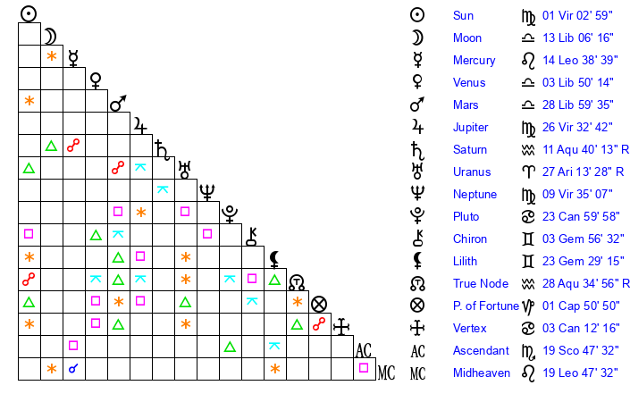| Moon | 13 Libra 9 | 18 Virgo 54 | 6 Pisces 47 |
