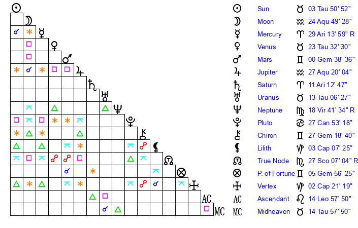 | Moon | 24 Aquarius 35 | 21 Pisces 16 | 29 Aries 34 |