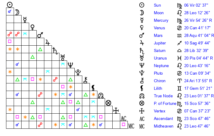 | Neptune | 20 Leo 43 | 1 Aries 24 | 22 Leo 32 |