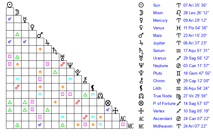 | Sun | 7 Aries 35 | 8 Aries 16 | 4 Leo 11 |