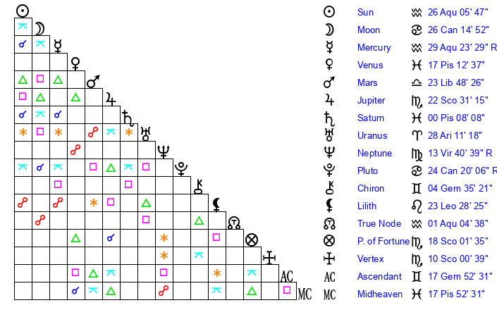 | Sun | 26 Aquarius 5 | 27 Aquarius 16 | 24 Taurus 53 |