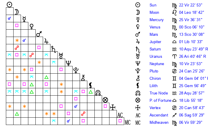 | Neptune | 10 Virgo 24 | 0 Aries 57 | 12 Virgo 22 |