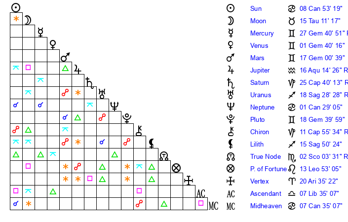 | Pluto | 18 Gemini 41 | 3 Aquarius 7 | 19 Gemini 23 |