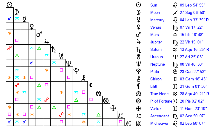 | Sun | 9 Leo 55 | 10 Leo 39 | 9 Scorpio 50 |