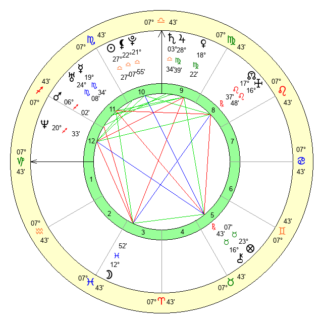 | Moon | 12 Pisces 58 | 18 Libra 34 | 10 Scorpio 24 |