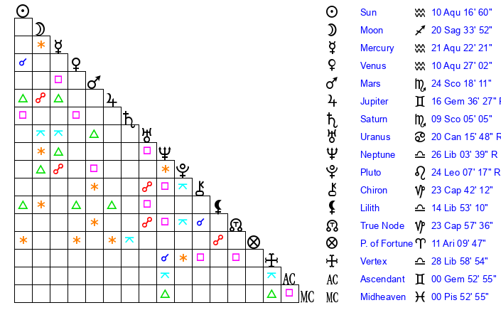 | Sun | 10 Aquarius 17 | 11 Aquarius 3 | 21 Aries 16 |