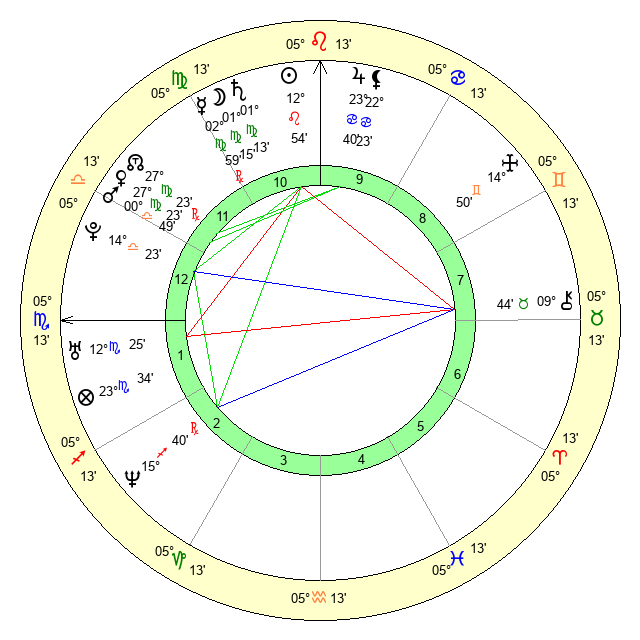 | Moon | 1 Virgo 23 | 29 Sagittarius 56 | 0 Gemini 8 |