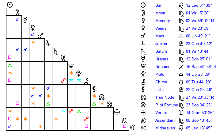 | Mercury | 2 Virgo 59 | 5 Leo 52 | 20 Virgo 48 |