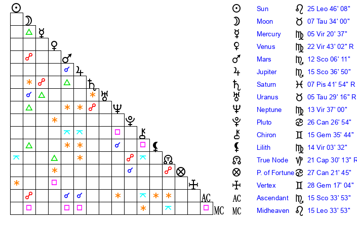 | Moon | 7 Taurus 32 | 12 Cancer 33 | 20 Leo 58 |