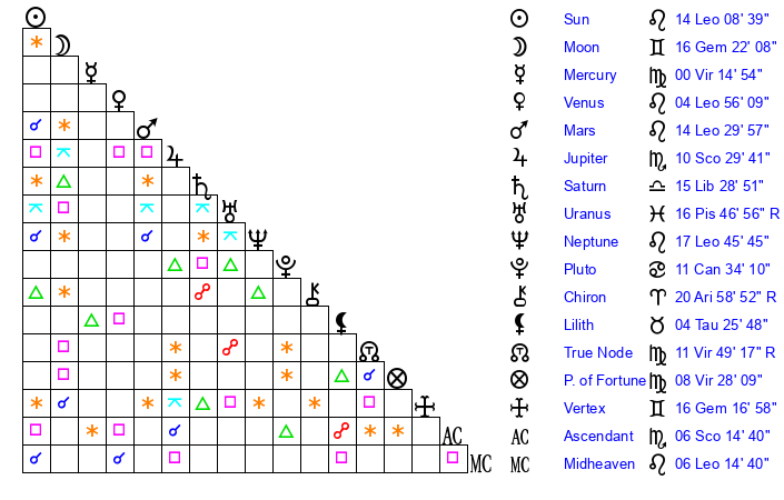 | Neptune | 17 Leo 45 | 1 Aries 52 | 20 Leo 22 |