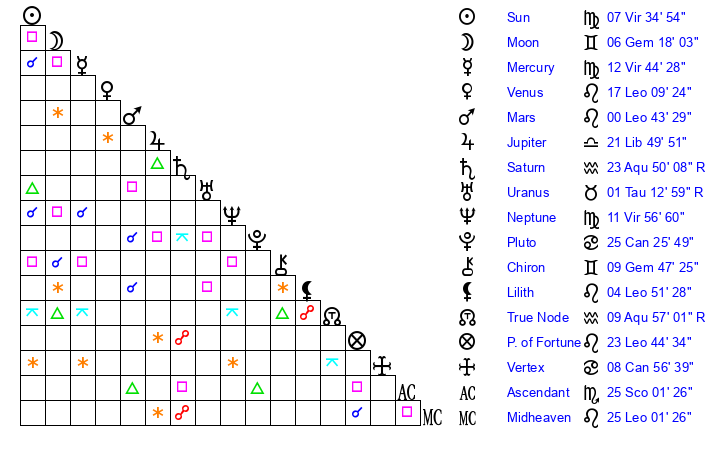 | Sun | 7 Virgo 35 | 8 Virgo 32 | 7 Sagittarius 48 |