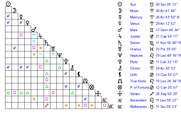 | Moon | 0 Aries 38 | 26 Capricorn 25 | 16 Scorpio 41 |