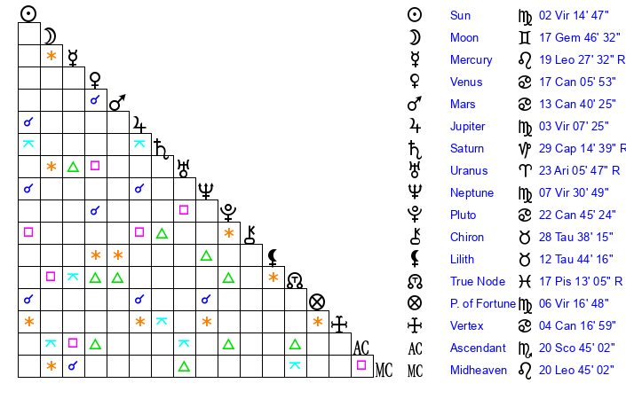 | Mercury | 19 Leo 27 | 16 Leo 6 | 20 Sagittarius 14 |
