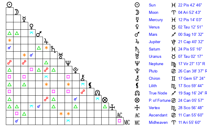 | Sun | 22 Pisces 42 | 23 Pisces 22 | 18 Gemini 24 |