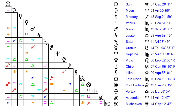 | Sun | 7 Capricorn 20 | 8 Capricorn 29 | 4 Aries 9 |