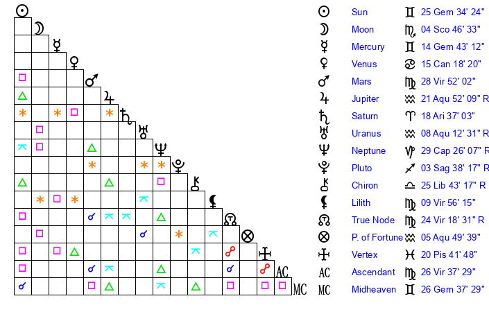 Moon | 4 Scorpio 41 | 29 Aquarius 19 | 12 Scorpio 38 |