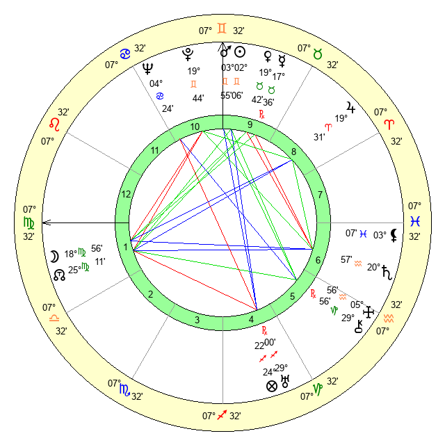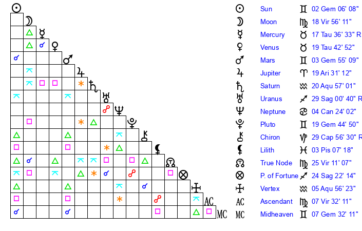 | Sun | 2 Gemini 6 | 2 Gemini 49 | 28 Virgo 16 |