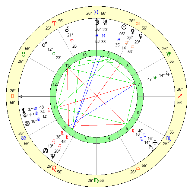 | Moon | 26 Pisces 55 | 22 Capricorn 44 | 13 Scorpio 15 |