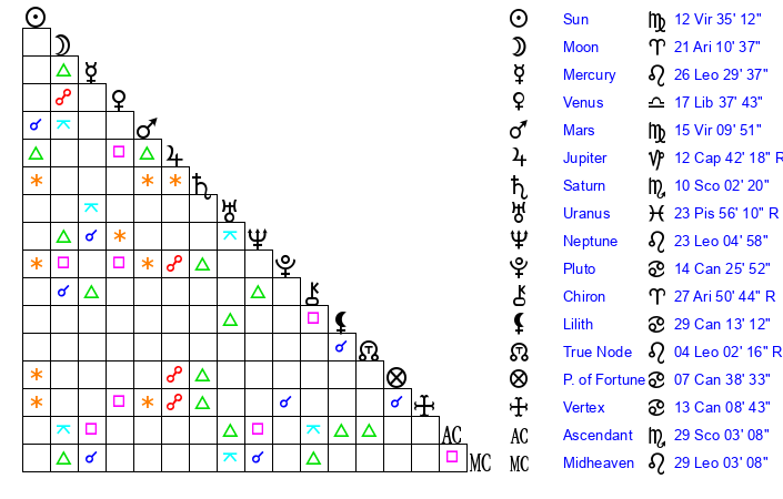 | Mercury | 26 Leo 30 | 6 Virgo 5 | 15 Sagittarius 8 |