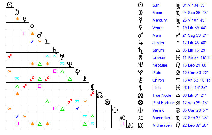| Venus | 19 Libra 59 | 3 Leo 36 | 25 Scorpio 15 |