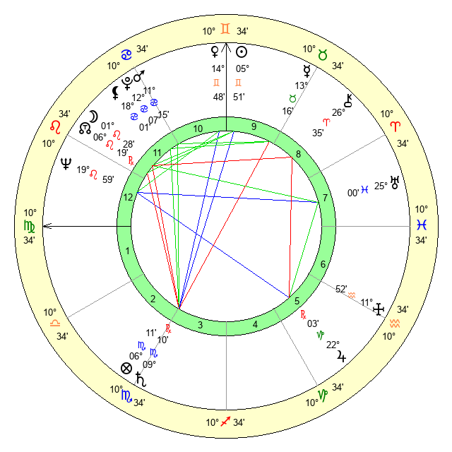 | Sun | 5 Gemini 52 | 6 Gemini 39 | 11 Virgo 37 |