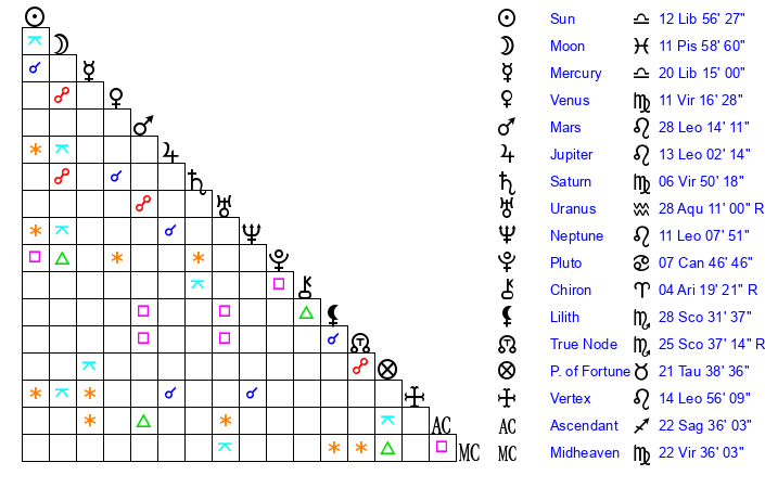 Sun | 12 Libra 56 | 14 Libra 15 | 29 Capricorn 56 |