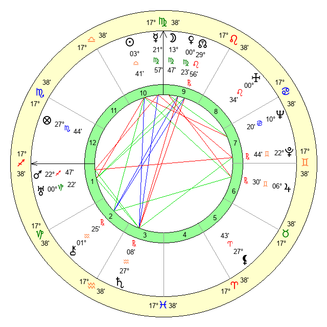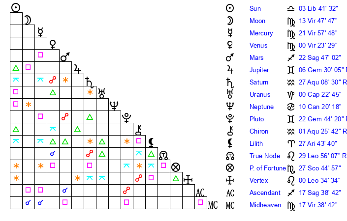 | Moon | 13 Virgo 47 | 7 Sagittarius 4 | 14 Aquarius 20 |