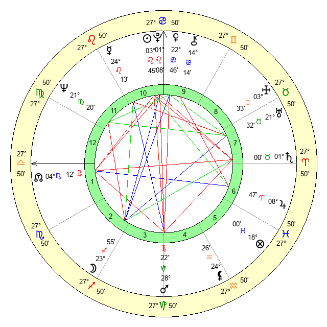 | Venus | 22 Cancer 46 | 26 Gemini 1 | 9 Scorpio 29 |