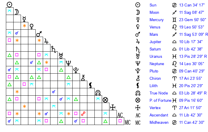 | Pluto | 9 Cancer 40 | 3 Aquarius 0 | 11 Cancer 12 |
