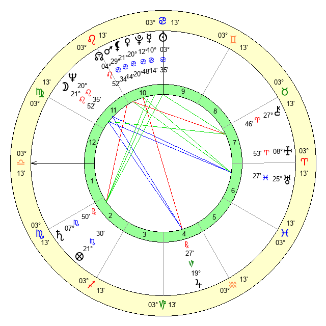 | Sun | 3 Cancer 35 | 4 Cancer 23 | 9 Libra 58 |
