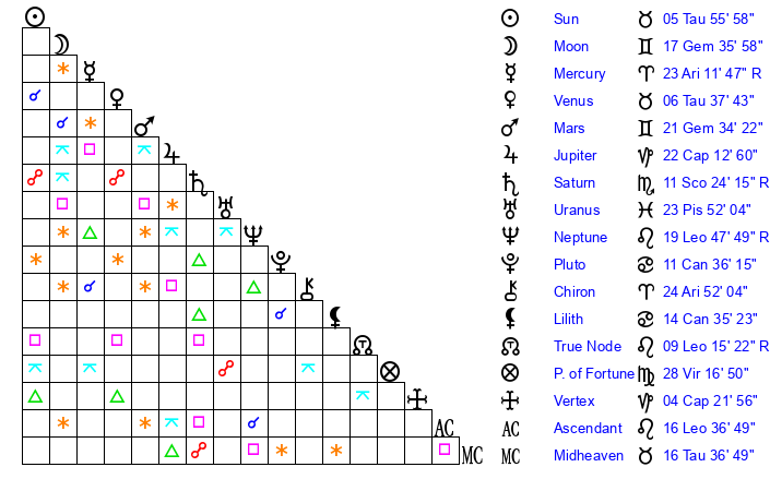| Sun | 5 Taurus 56 | 6 Taurus 43 | 11 Leo 46 |