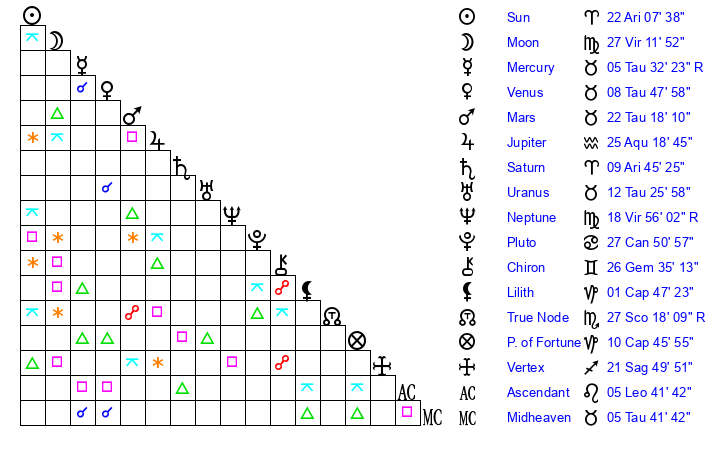| Sun | 22 Aries 7 | 23 Aries 2 | 15 Cancer 51 |