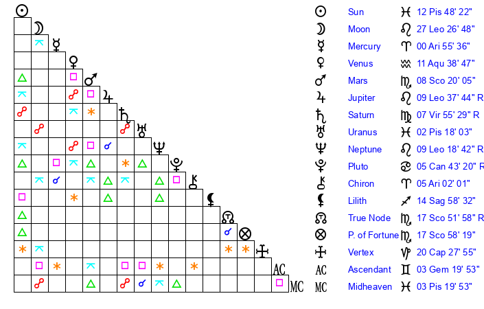 | Neptune | 9 Leo 18 | 28 Pisces 59 | 9 Leo 37 |