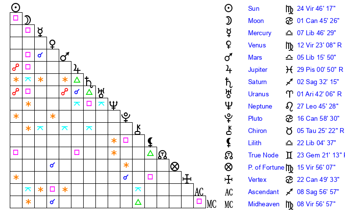 | Sun | 24 Virgo 46 | 26 Virgo 2 | 2 Capricorn 55 |