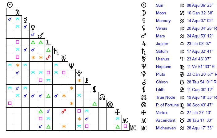 | Sun | 8 Aquarius 6 | 9 Aquarius 2 | 8 Taurus 40 |