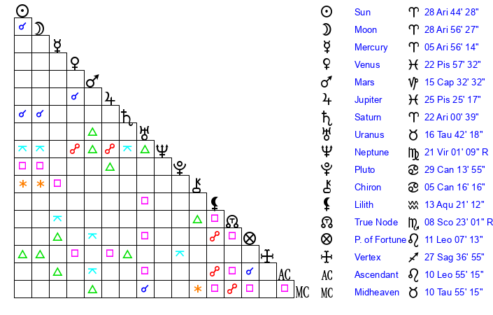 | Moon | 29 Aries 2 | 13 Capricorn 43 | 21 Gemini 20 |