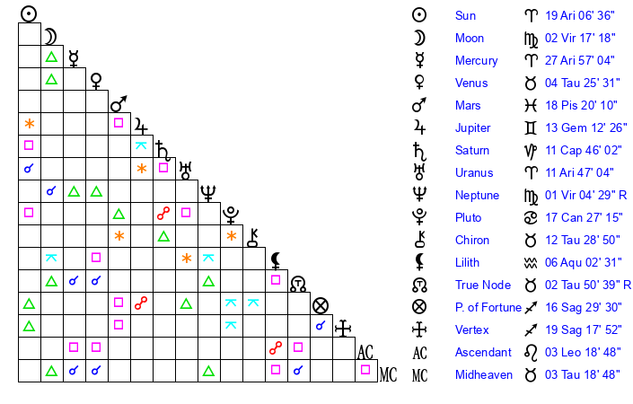 | Sun | 19 Aries 7 | 20 Aries 5 | 20 Cancer 33 |