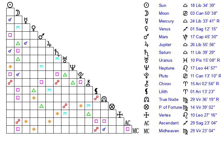 | Sun | 18 Libra 35 | 19 Libra 37 | 2 Aquarius 41 |