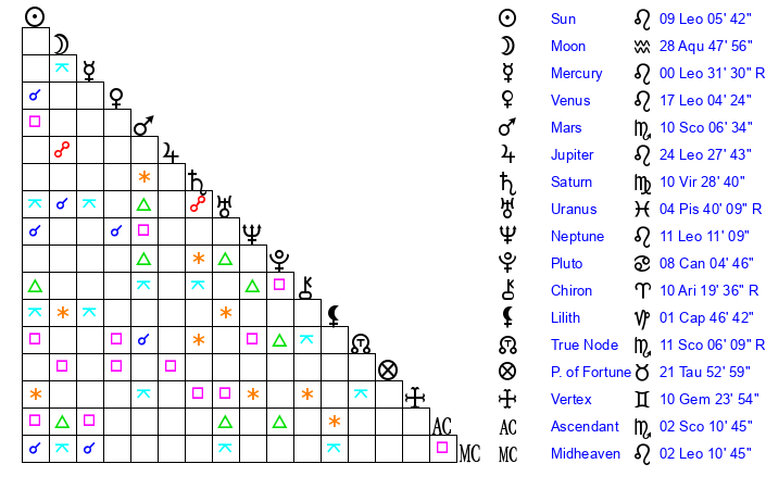 | Neptune | 11 Leo 11 | 1 Aries 57 | 13 Leo 45 |