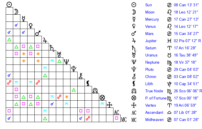 | Neptune | 18 Virgo 37 | 2 Aries 10 | 21 Virgo 18 |