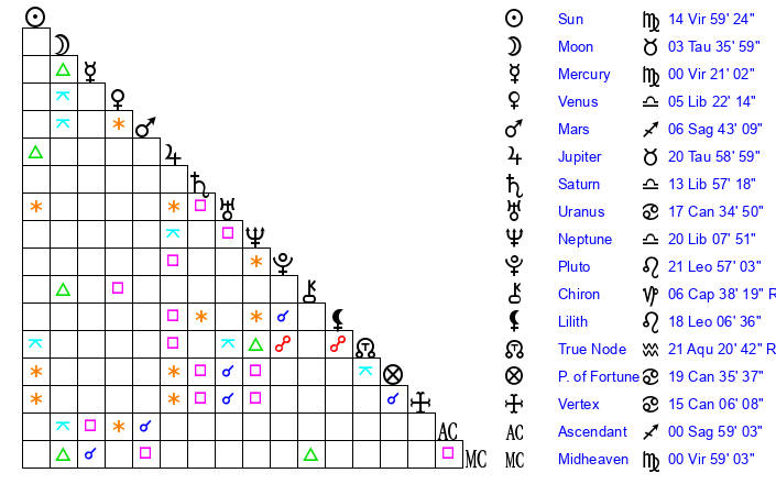 | Mercury | 0 Virgo 21 | 9 Virgo 57 | 16 Sagittarius 29 |
