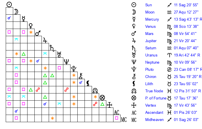 | Sun | 11 Sagittarius 20 | 11 Sagittarius 47 | 15 Pisces 41 |