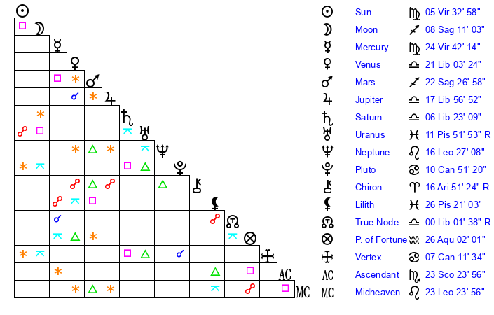 | Moon | 8 Sagittarius 16 | 19 Scorpio 37 | 5 Virgo 1 |