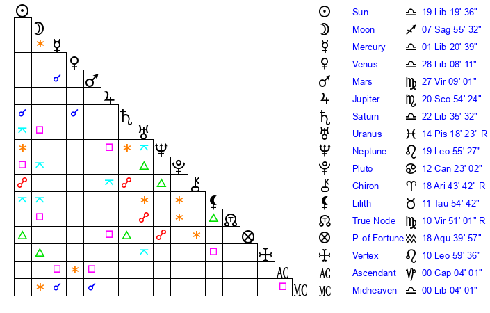 | Saturn | 23 Libra 9 | 26 Pisces 44 | 2 Scorpio 38 |