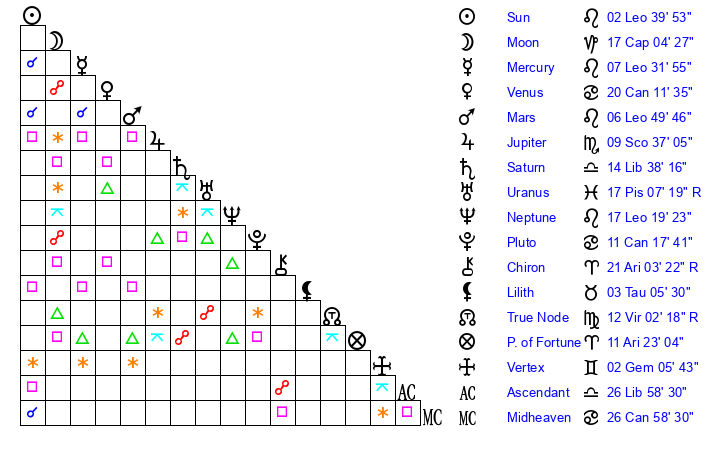 | Moon | 16 Capricorn 59 | 27 Leo 48 | 1 Libra 2 |