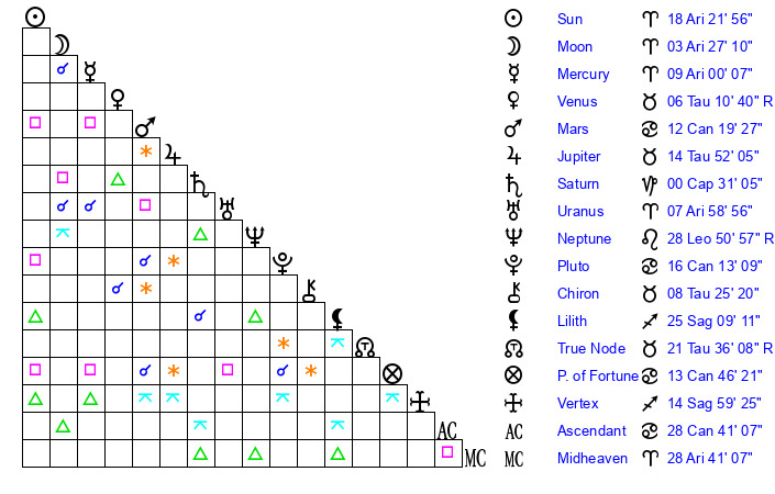 | Sun | 18 Aries 22 | 19 Aries 6 | 20 Cancer 47 |