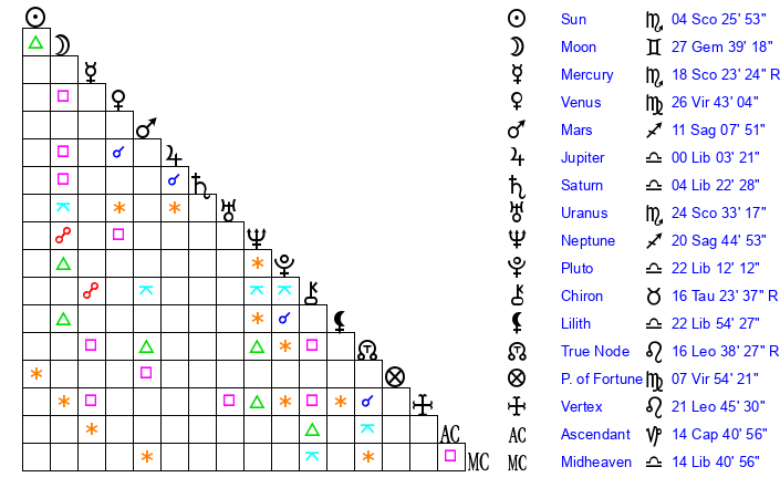 | Saturn | 4 Libra 44 | 25 Pisces 54 | 8 Libra 53 |